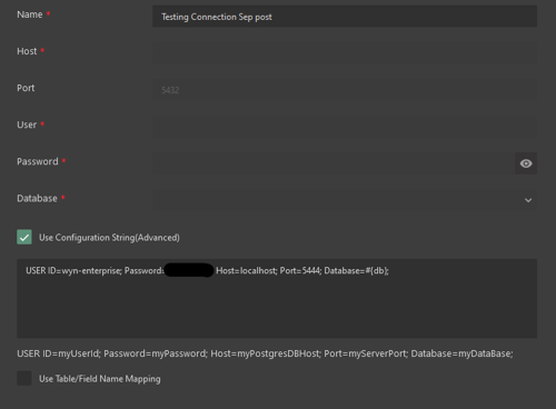 To use the user context you will do similar with the @{value} format. The most common use case for these would be if you monitor your database by who access it with using values for Username and Password areas of the connection string.