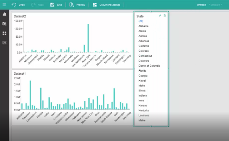 1. Create a new dashboard or use an existing one with charts employing different datasets that share a common field (e.g., State).