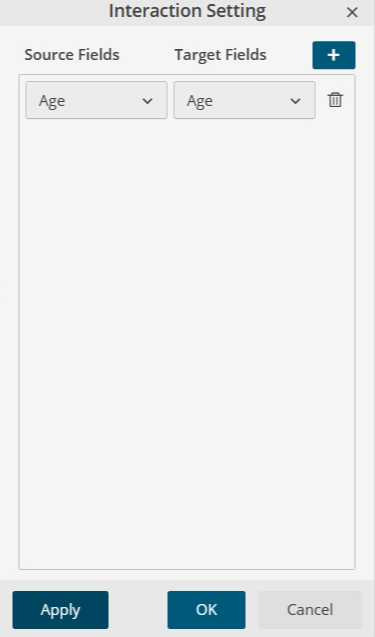If visuals are based on different datasets, you may observe the first symbol in gray. Clicking on the icon reveals the Interaction Panel, enabling you to bind common values from both datasets. This facilitates visuals interacting with each other despite disparate datasets.